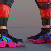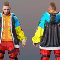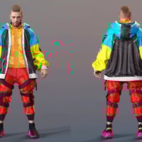 This outfit includes: a loose-fitting jacket, pants with knee pads, an inner top, and colorful sneakers.