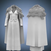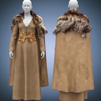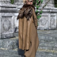 - Fur-Trimmed Cloak: A long, tan suede-style cape is draped over the shoulders. It comes topped with a thick, multi-toned faux fur shawl or collar that wraps around the neck and shoulders as its own preset.