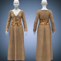 - Brocade Gown: A long, gold-colored, floor-length dress with long sleeves, a deep V-neckline, and a wide, brown leather-like embossed corset belt