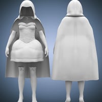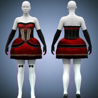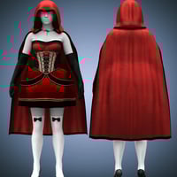 A whimsical Red Riding Hood–inspired outfit with cape, corset, and voluminous skirt—ideal for fantasy, cosplay, or seasonal scenes. Featuring a cape, dress, gloves, heels, stockings, and panties.